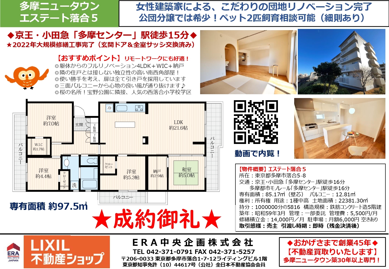 【成約御礼】多摩ニュータウン団地再生プロジェクト成約御礼【多摩ニュータウン団地再生プロジェクト」エステート落合&タウンハウス貝取【2023-06-20更新】売買 | LIXIL不動産ショップ多摩センター店 中央企画
